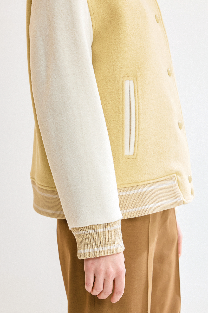 가슴 한쪽에 자수를 더해 포인트를 주었으며, 넥과 소맷단, 밑단에 스트라이프 패턴의 리브 블록으로 섬세하게 완성했습니다.