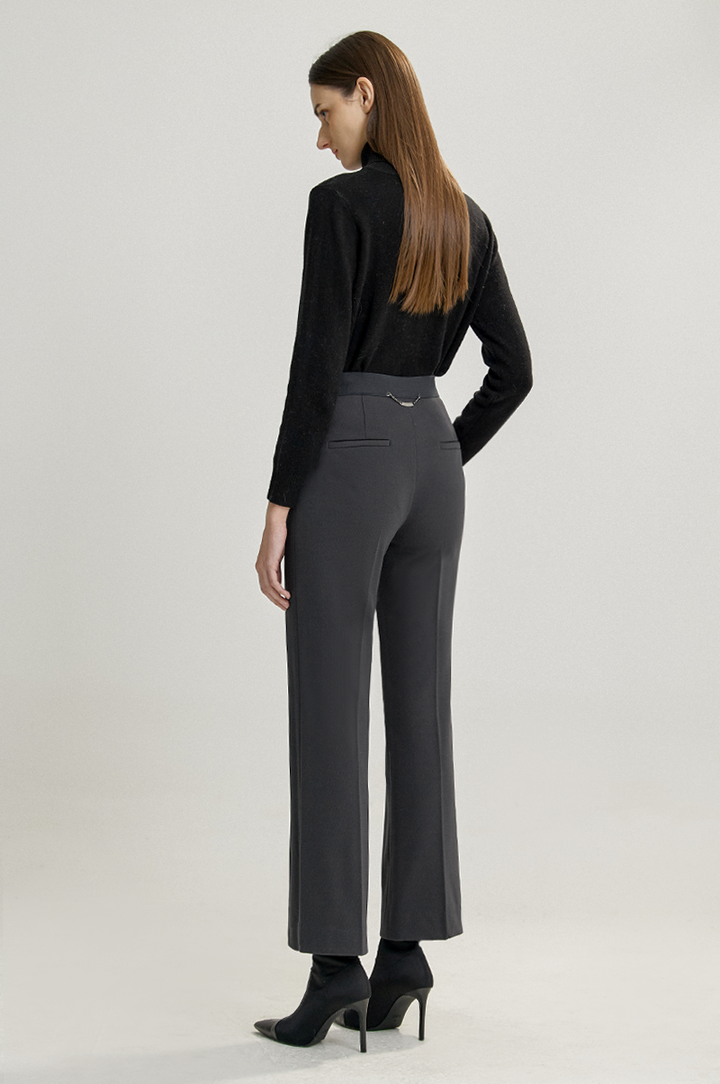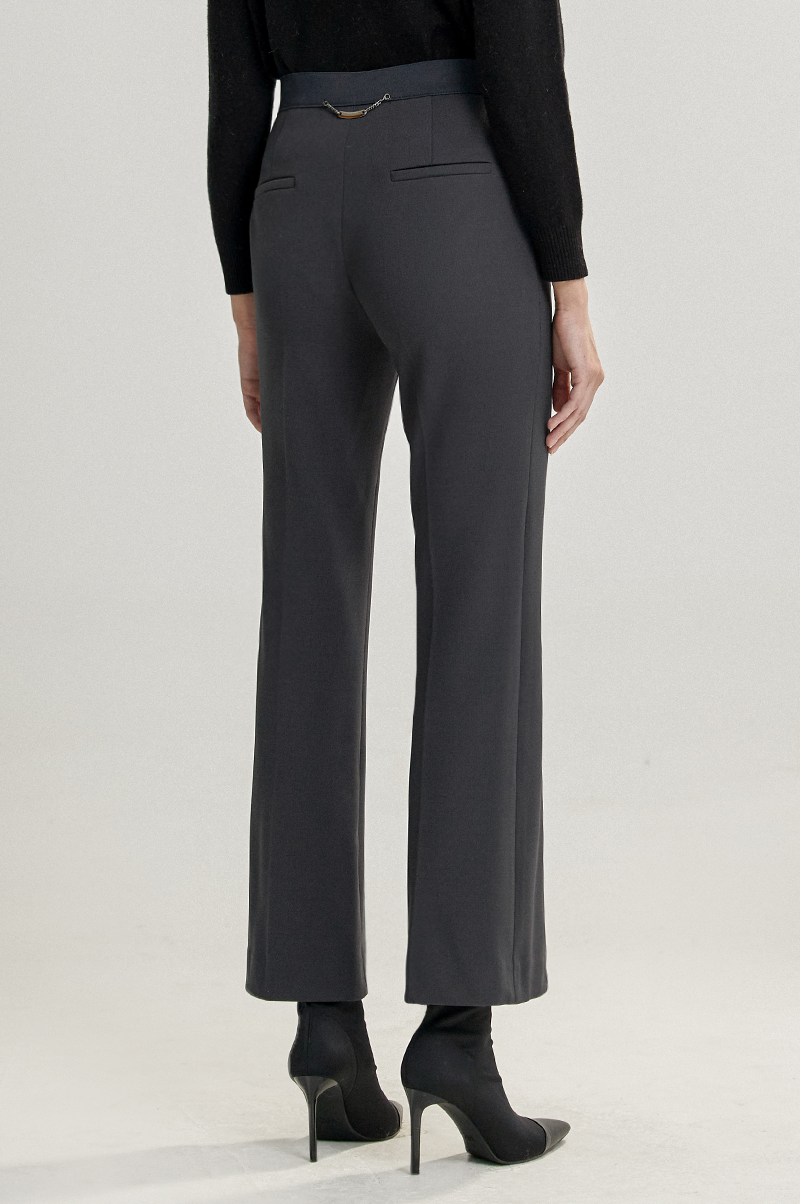 레그라인을 따라 잡은 주름이 다리를 한층 슬림하고 길어보이도록 연출하며, 앞면의 유니크한 포켓 디테일과 뒤 허리 라인에 메탈 체인 스트랩을 더해 포인트가 돋보이는 아이템입니다.