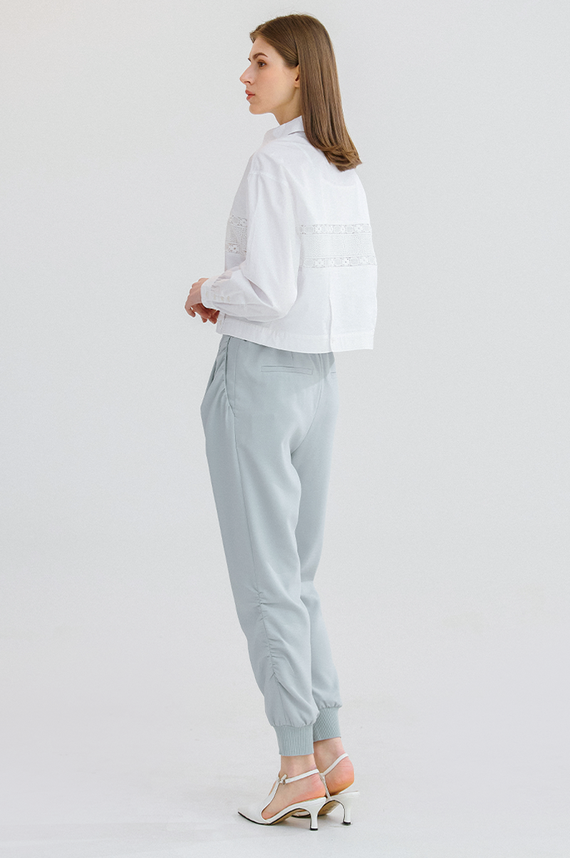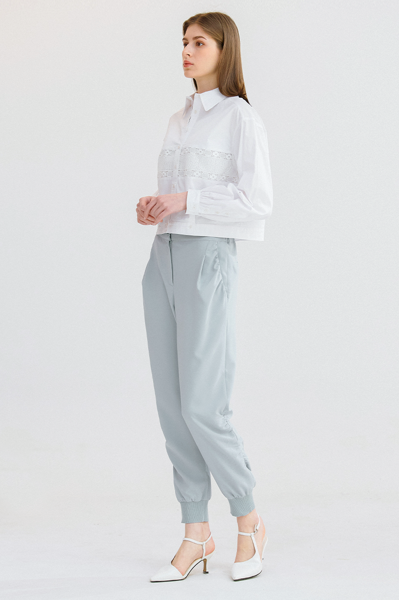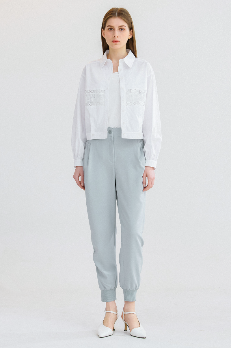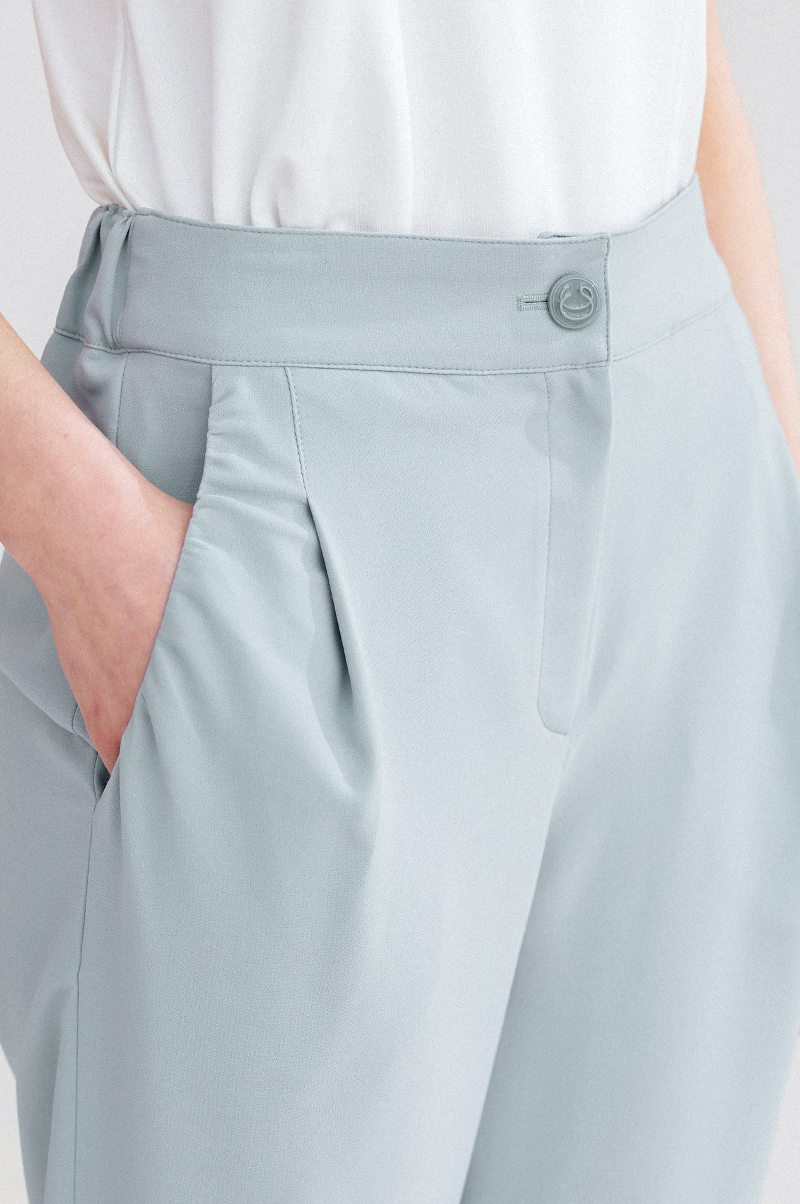 슬림한 일자핏의 실루엣으로 뒤 허리 라인에 밴딩, 밑단에 리브 니팅 소재를 블록하여 탄력이 있으면서 라인을 잡아주고 신축성이 뛰어난 스판 혼방 소재를 사용해 편안한 착용감을 전해줍니다.