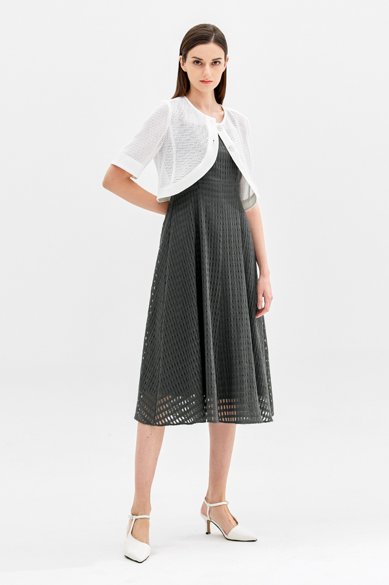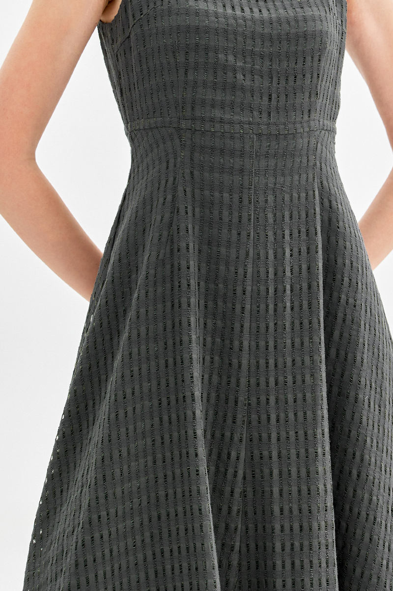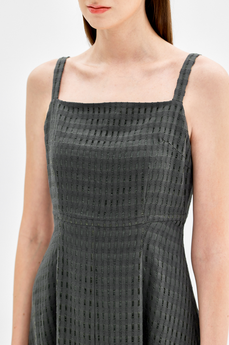 넥라인이 드러나는 슬리브리스 디자인으로 가슴 상단에 다트를 넣어 입체감을 주면서 허리 라인을 강조, 밑단으로 갈수록 자연스럽게 플레어지는 페미닌한 실루엣을 연출합니다.