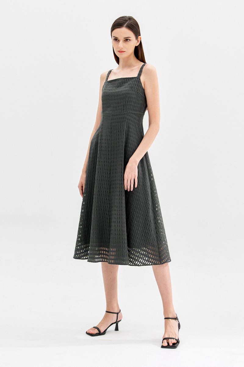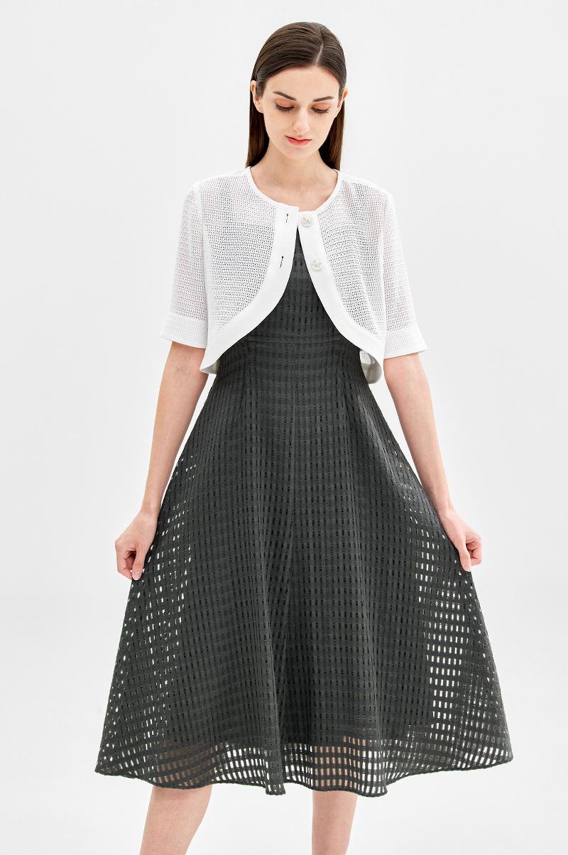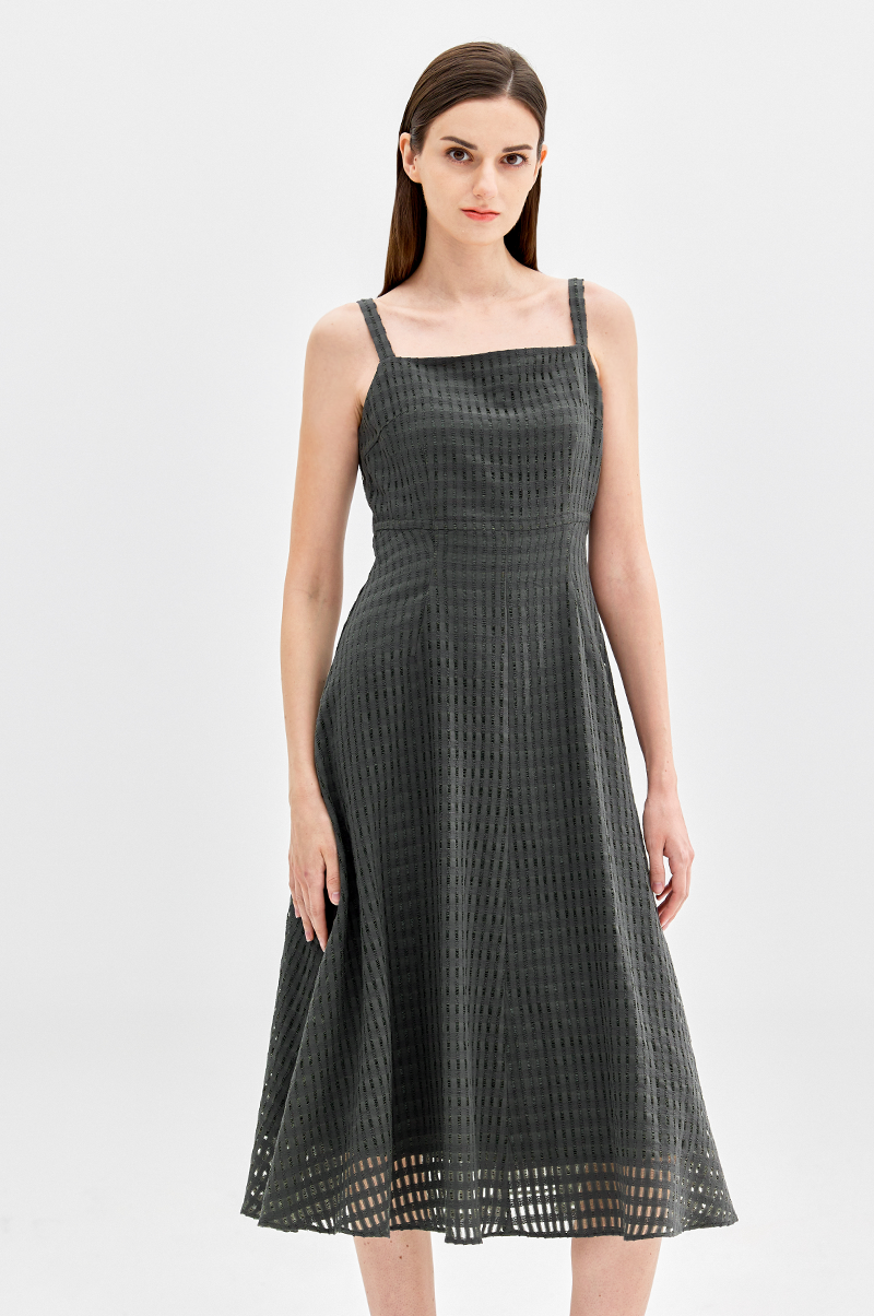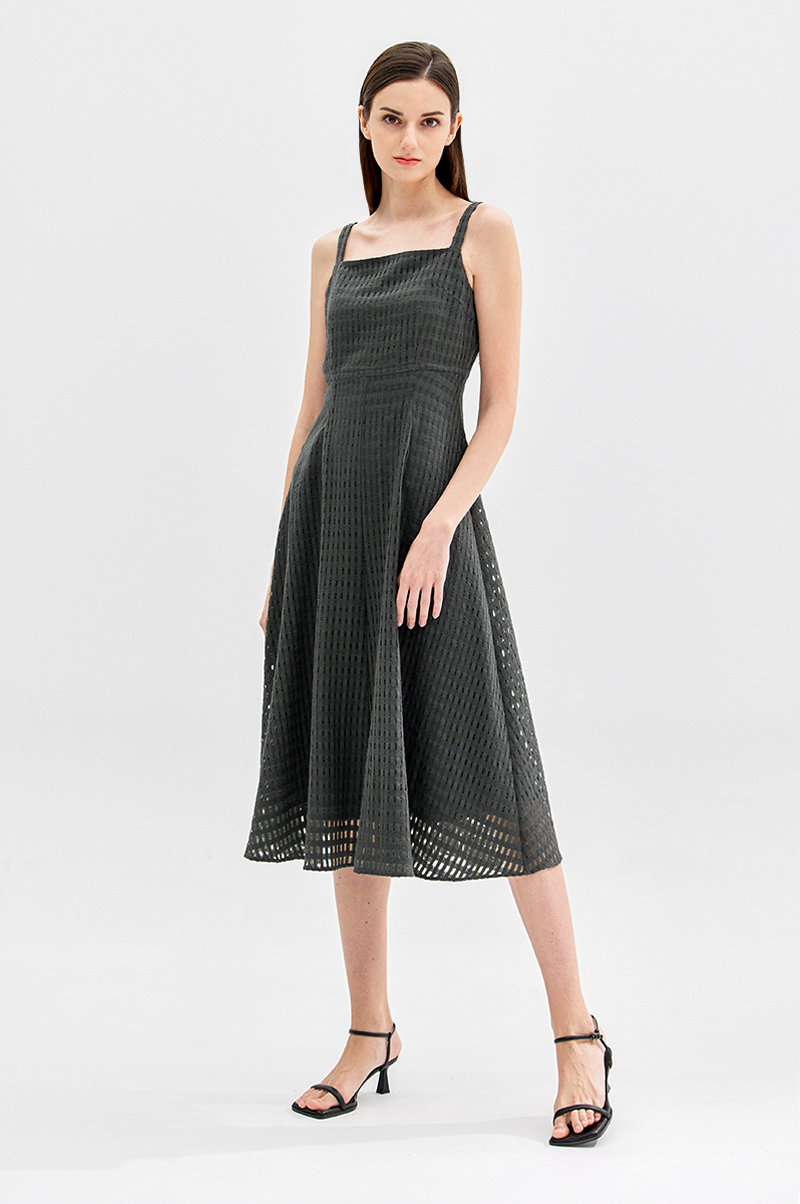 넥라인이 드러나는 슬리브리스 디자인으로 가슴 상단에 다트를 넣어 입체감을 주면서 허리 라인을 강조, 밑단으로 갈수록 자연스럽게 플레어지는 페미닌한 실루엣을 연출합니다.