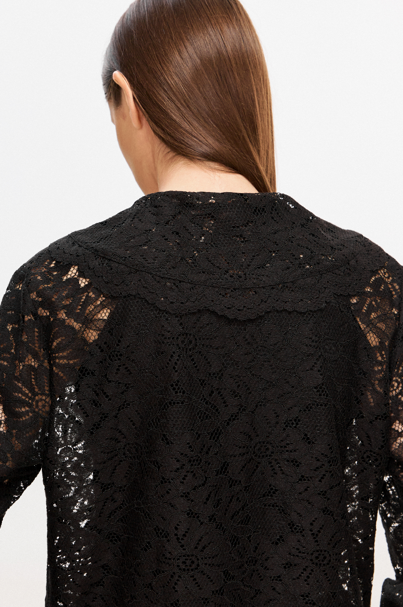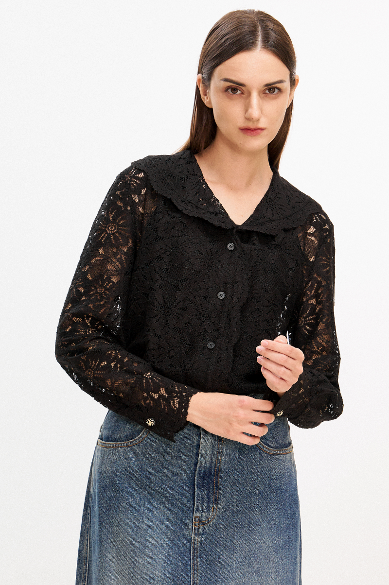 섬세한 꽃 모티브의 레이스 소재가 페미닌한 무드를 자아내며 어깨를 따라 자연스럽게 뒤로 넘어가는 세일러 칼라 디자인이 간결한 디자인에 포인트가 됩니다.