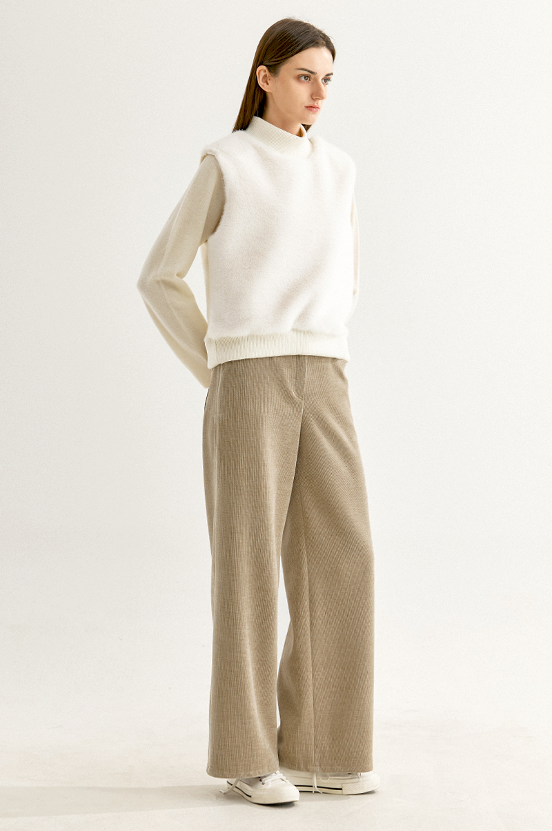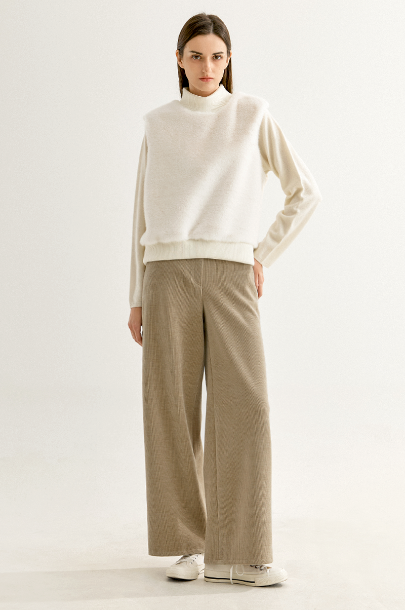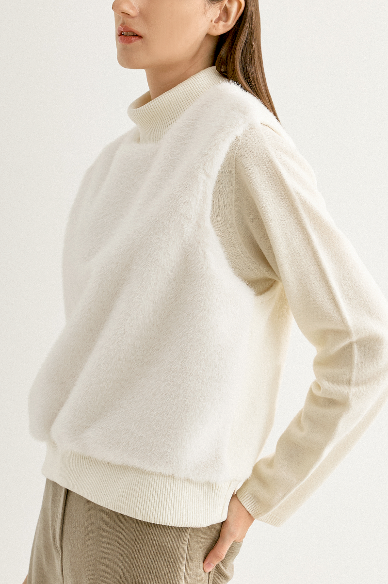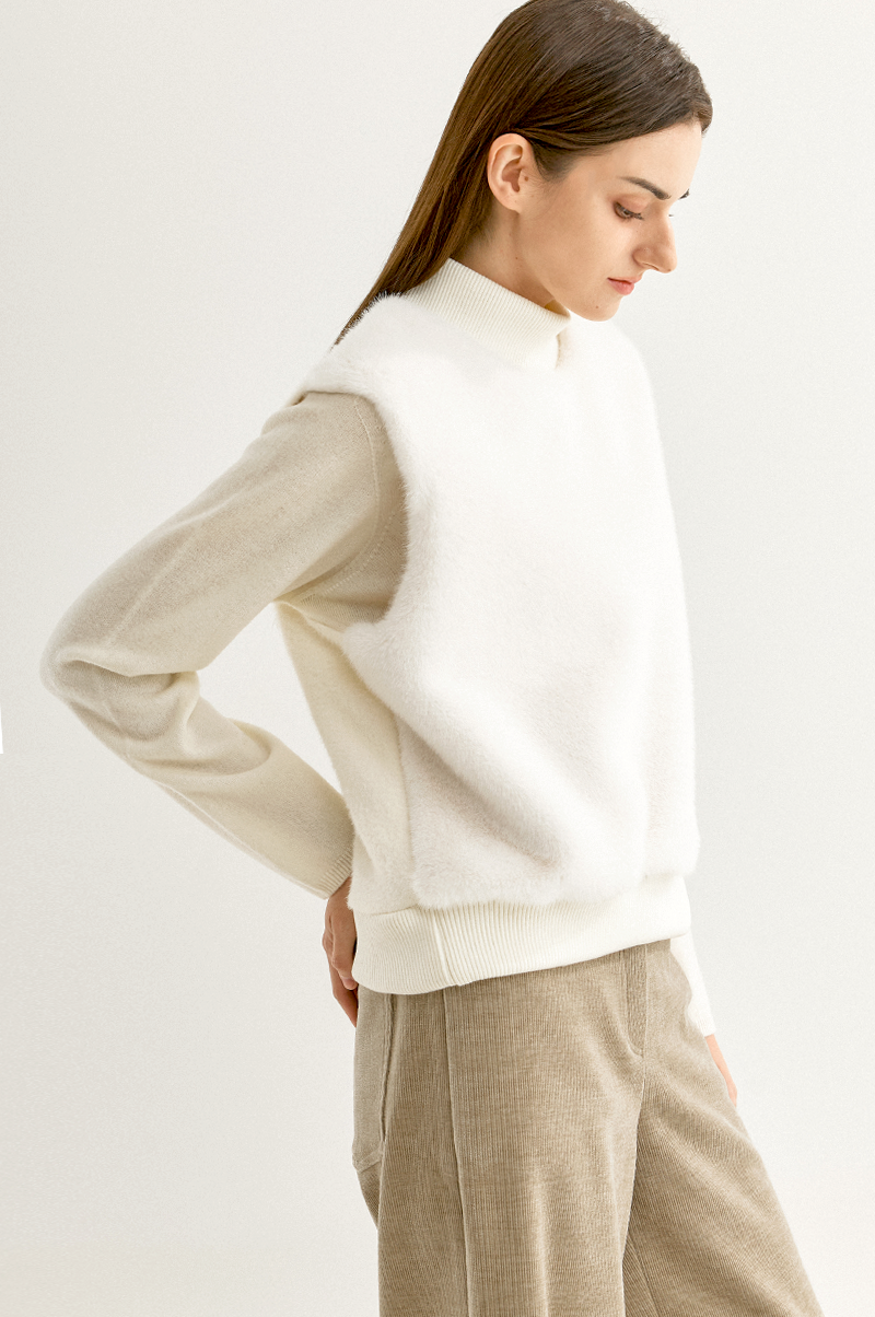부드러운 감촉과 고급스러운 결이 눈길을 끄는 페이크 밍크 퍼와 포근한 터치감의 울 혼방 니트 텍스처가 어우러진 베스트입니다.