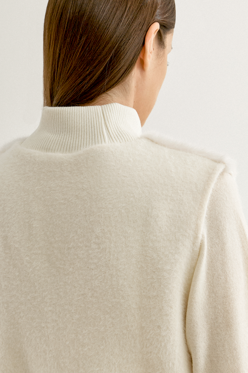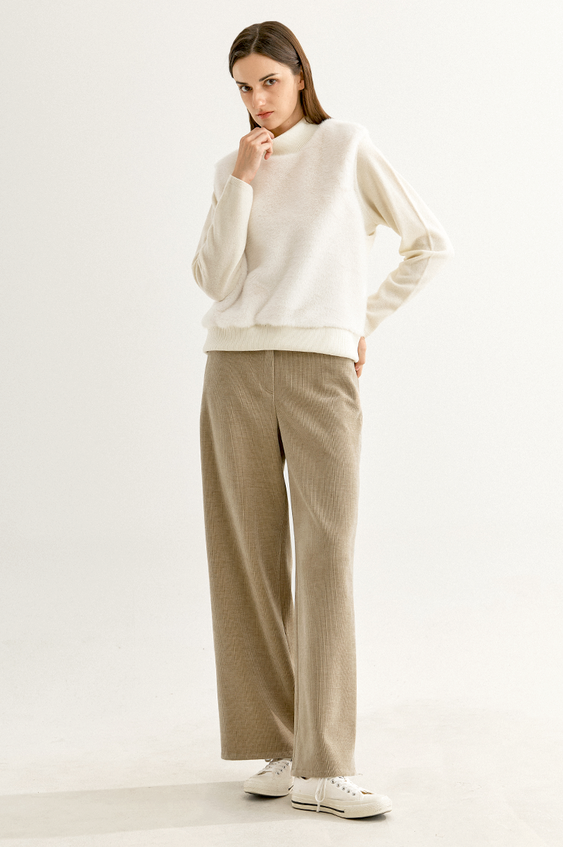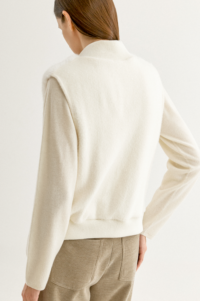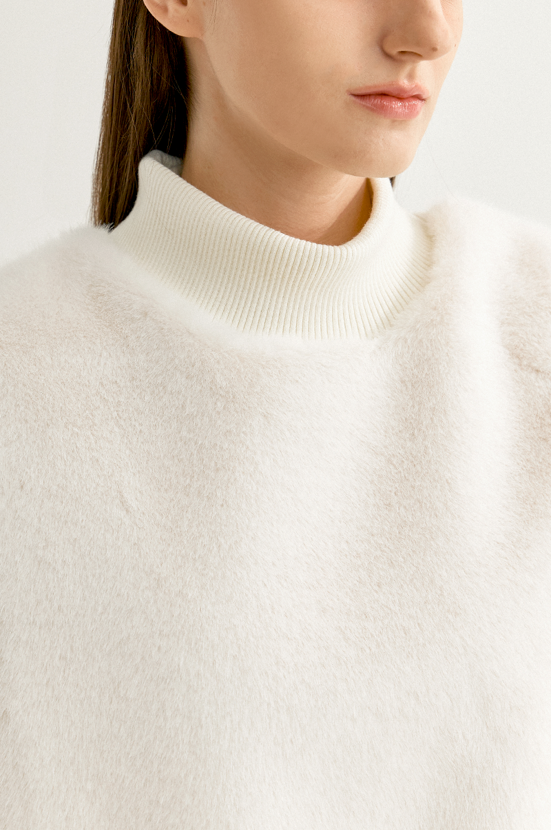 부드러운 감촉과 고급스러운 결이 눈길을 끄는 페이크 밍크 퍼와 포근한 터치감의 울 혼방 니트 텍스처가 어우러진 베스트입니다.