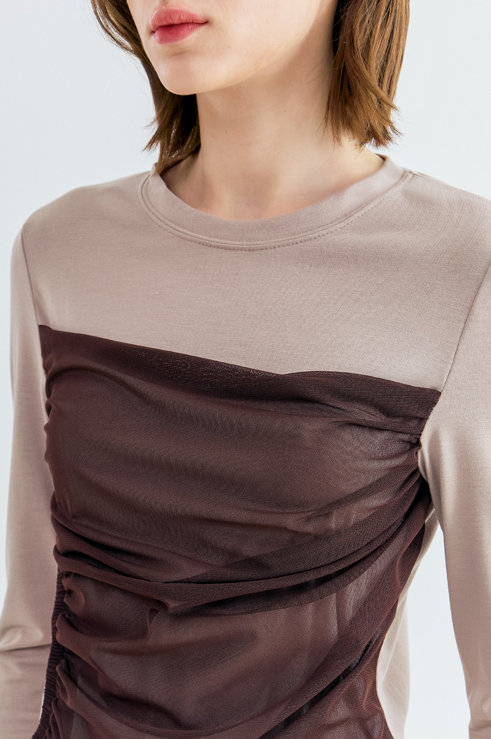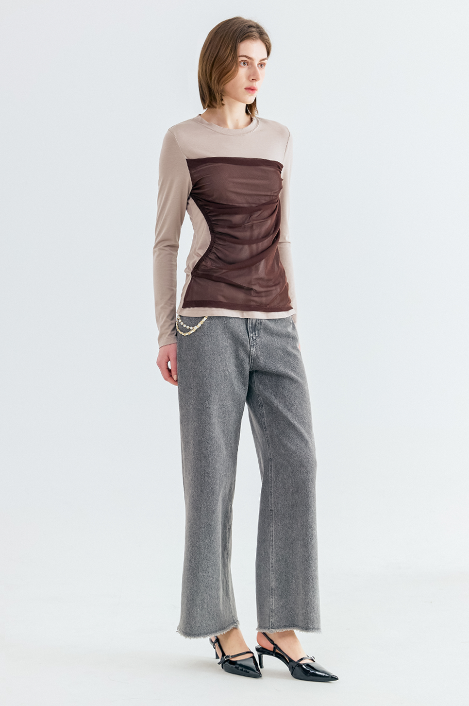 앞면에 은은한 비침이 있는 시어한 소재를 블록하여 마치 뷔스티에를 레이어하여 입은 듯한 외관을 자아내는 아이템으로, 스판이 혼방되어 편안한 착용감을 선사하며 허리 한쪽에 유니크한 써클 홀 디테일로 포인트를 더하였습니다.