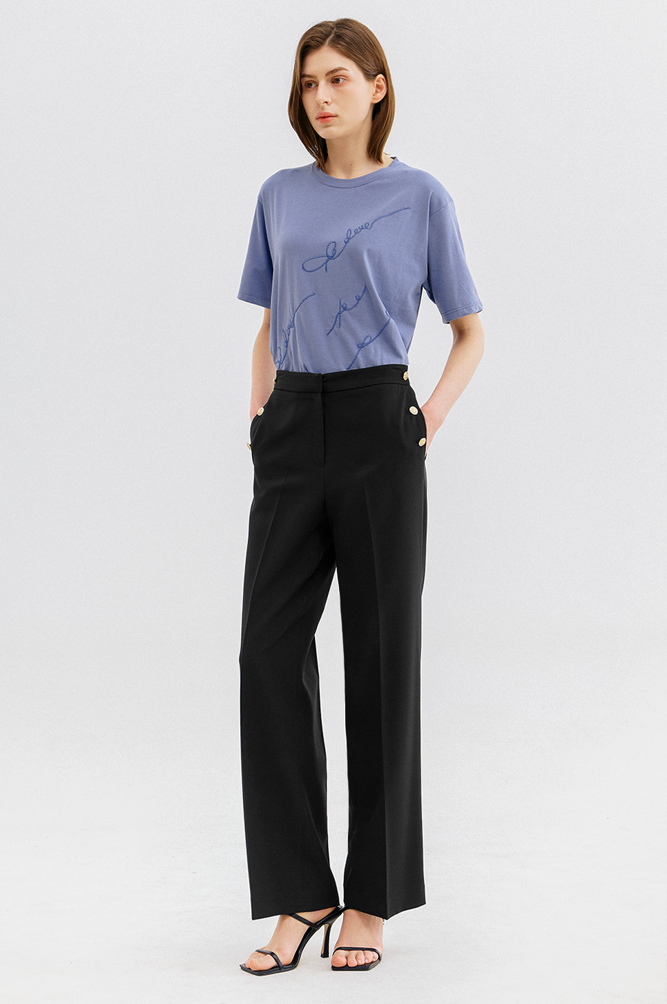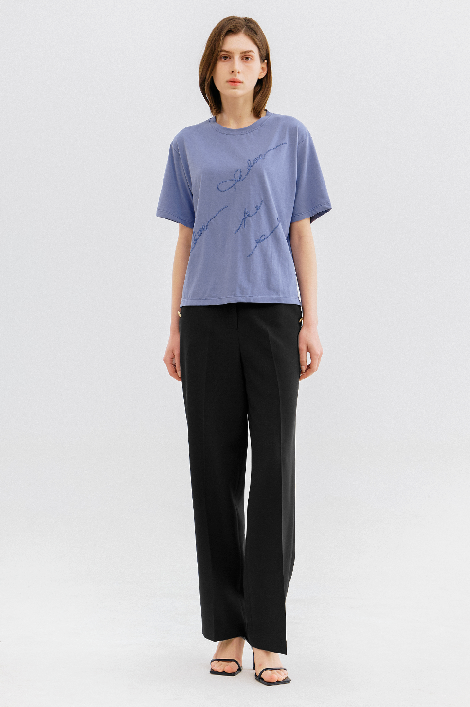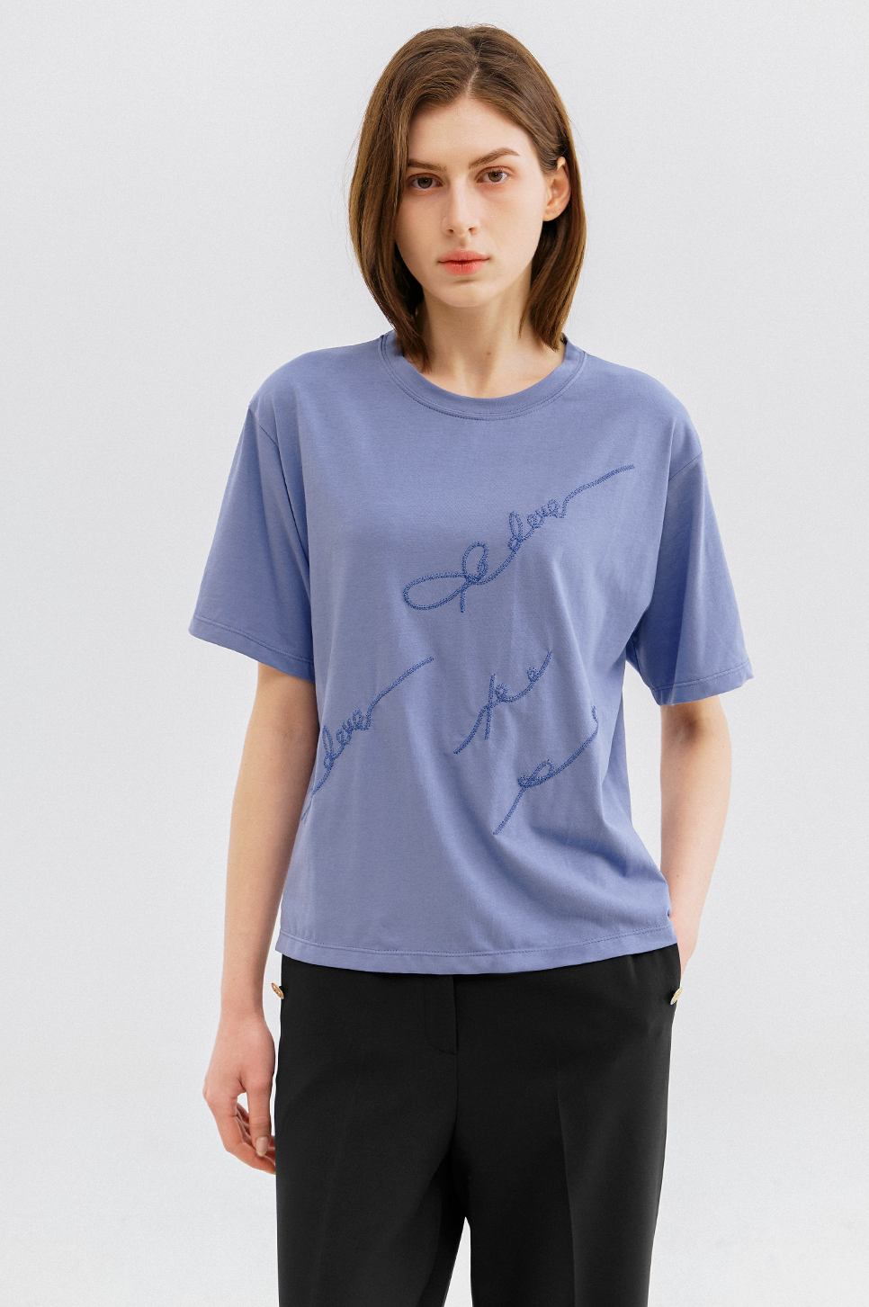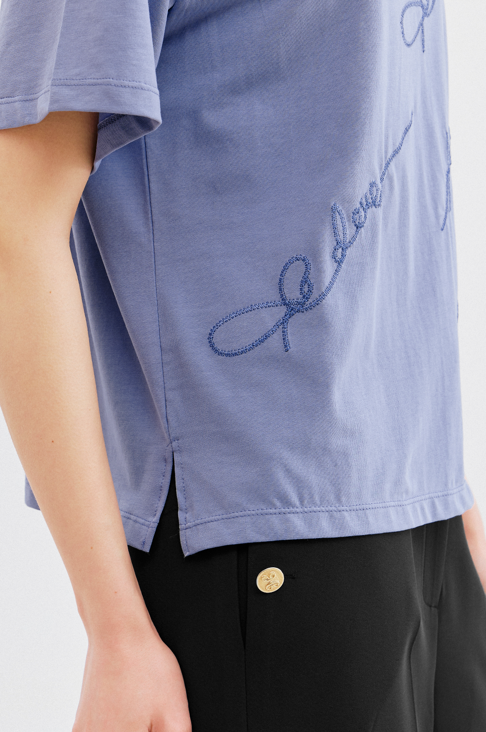 가볍고 부드러운 터치감이 돋보이는 소재로 간결한 라운드 넥과 짧지 않은 하프 슬리브 디자인이 특징이며, 여유로운 실루엣으로 편안한 착용감을 전해줍니다.
