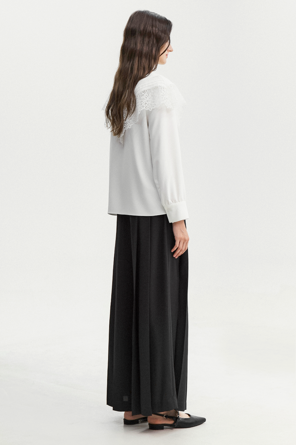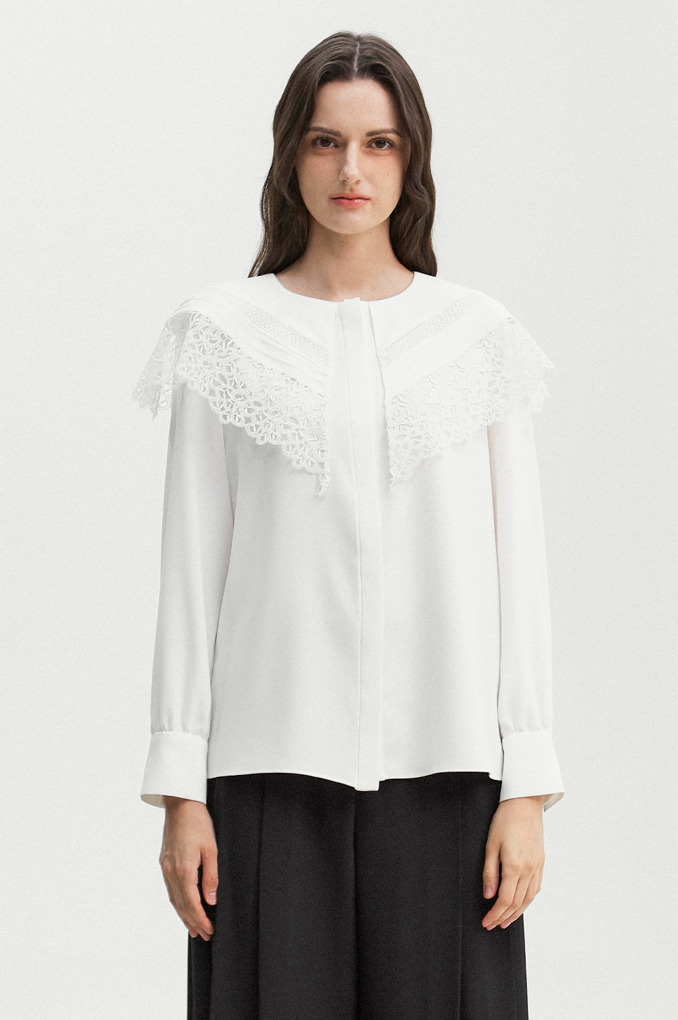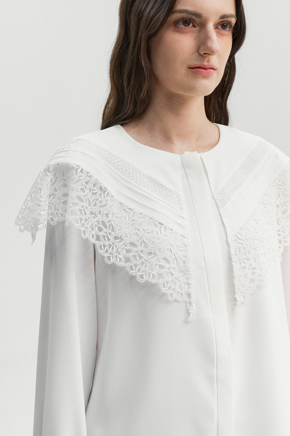 심플한 라운드넥에 부분적으로 레이스를 블록한 케이프를 매칭하여 페미닌하면서도 우아하게 표현한 아이템입니다.