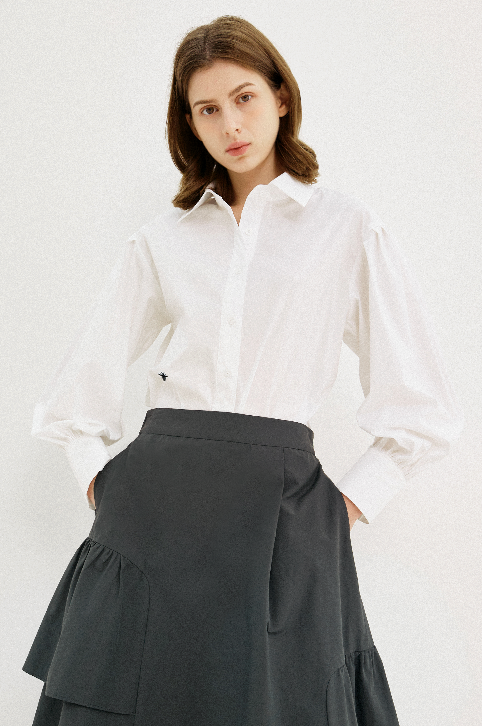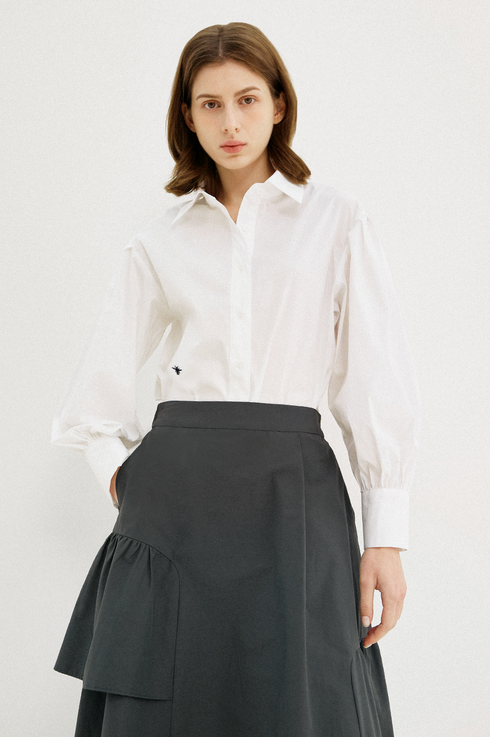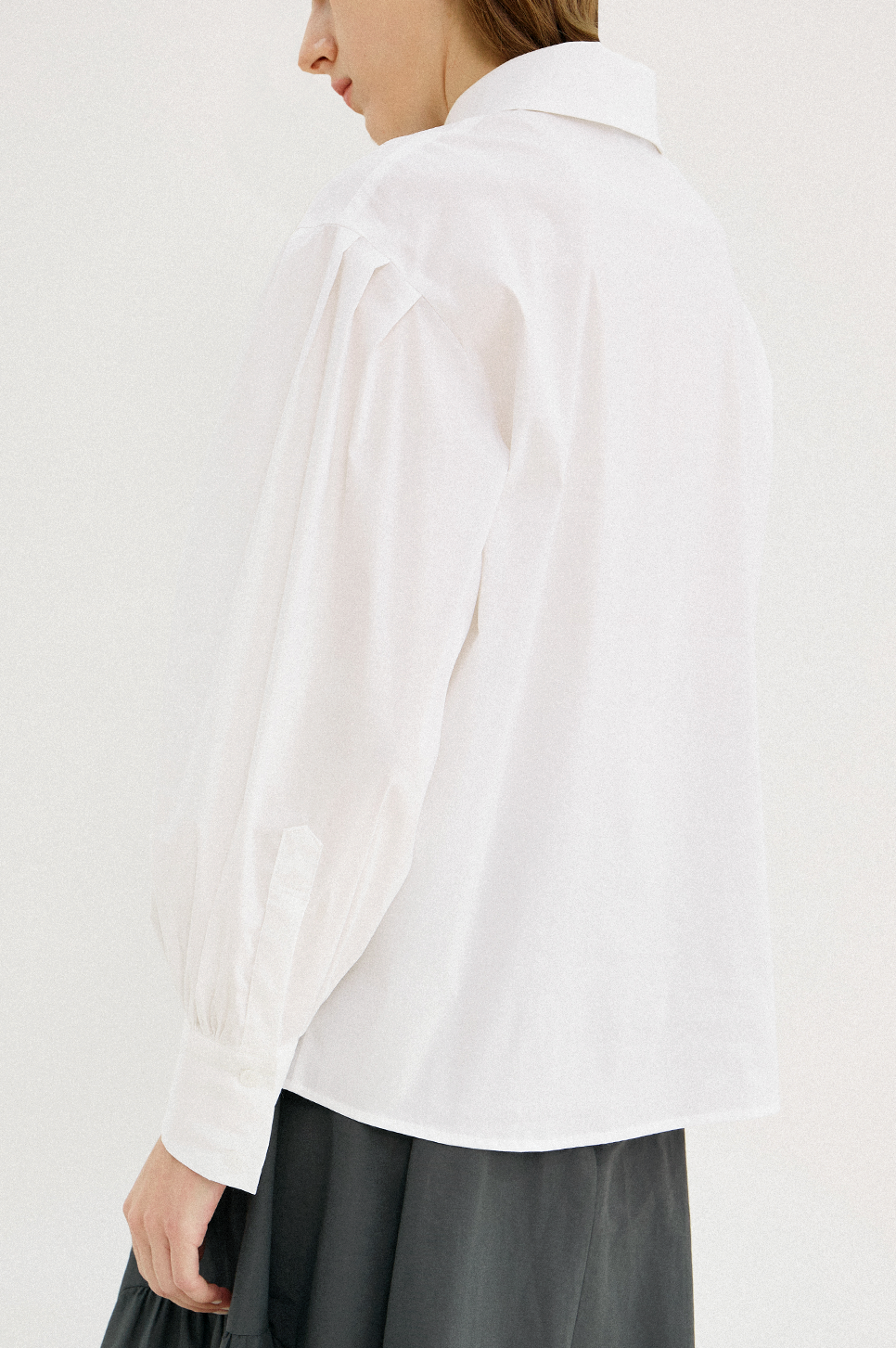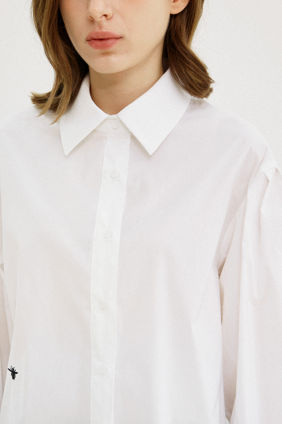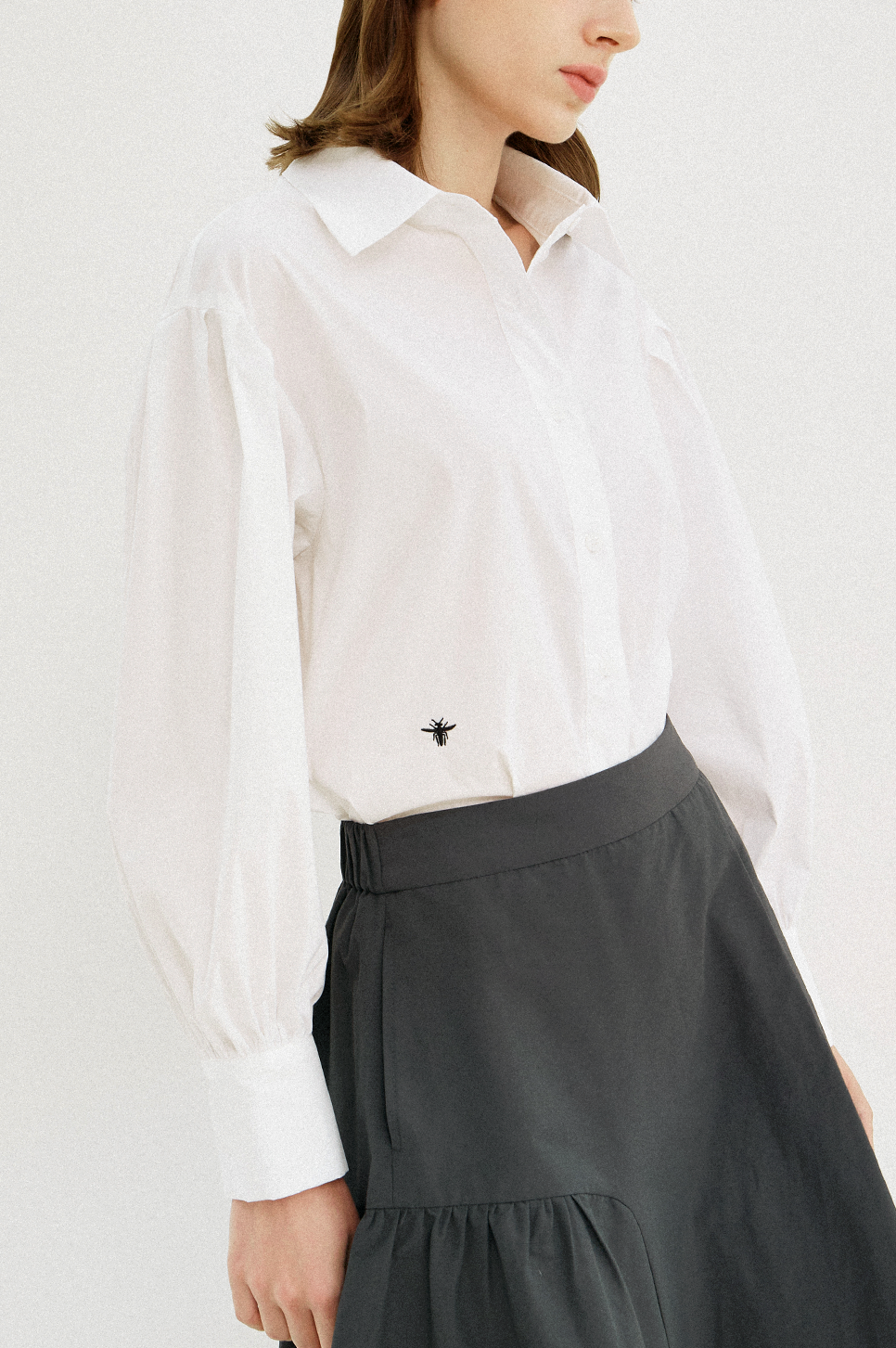 어깨 라인에 섬세한 턱 디테일과 소맷단에 셔링으로 볼륨감 있는 퍼프 슬리브를 연출하며 시크하면서도 페미닌한 감성을 전해주는 아이템으로, 부드러운 터치감과 탄탄한 텍스처의 소재를 사용하여 안정된 실루엣을 연출합니다.