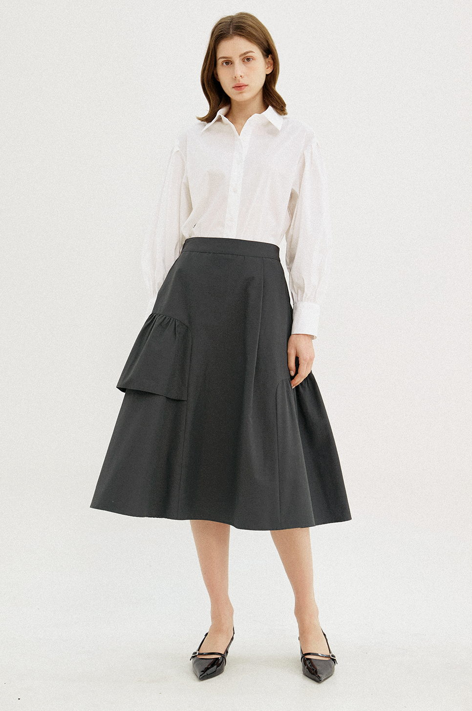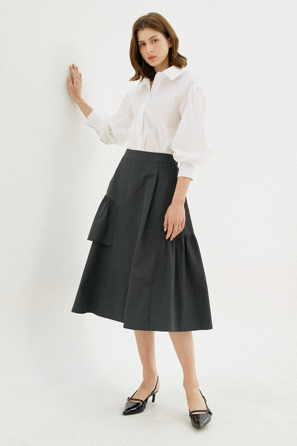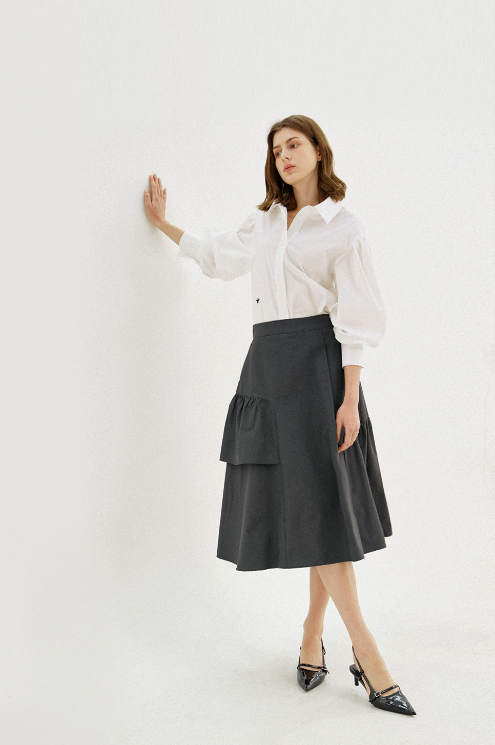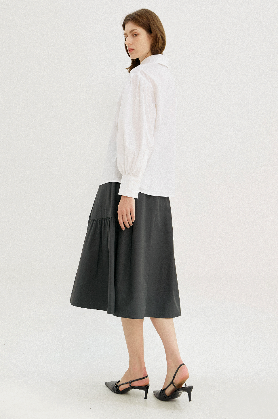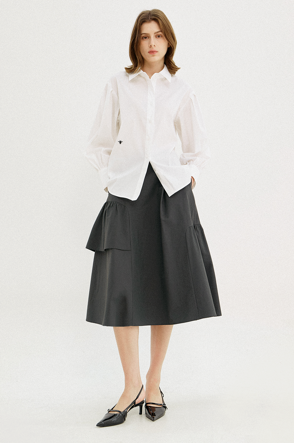 어깨 라인에 섬세한 턱 디테일과 소맷단에 셔링으로 볼륨감 있는 퍼프 슬리브를 연출하며 시크하면서도 페미닌한 감성을 전해주는 아이템으로, 부드러운 터치감과 탄탄한 텍스처의 소재를 사용하여 안정된 실루엣을 연출합니다.