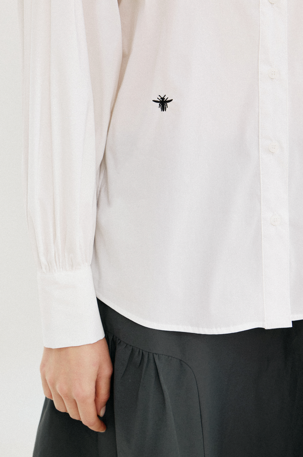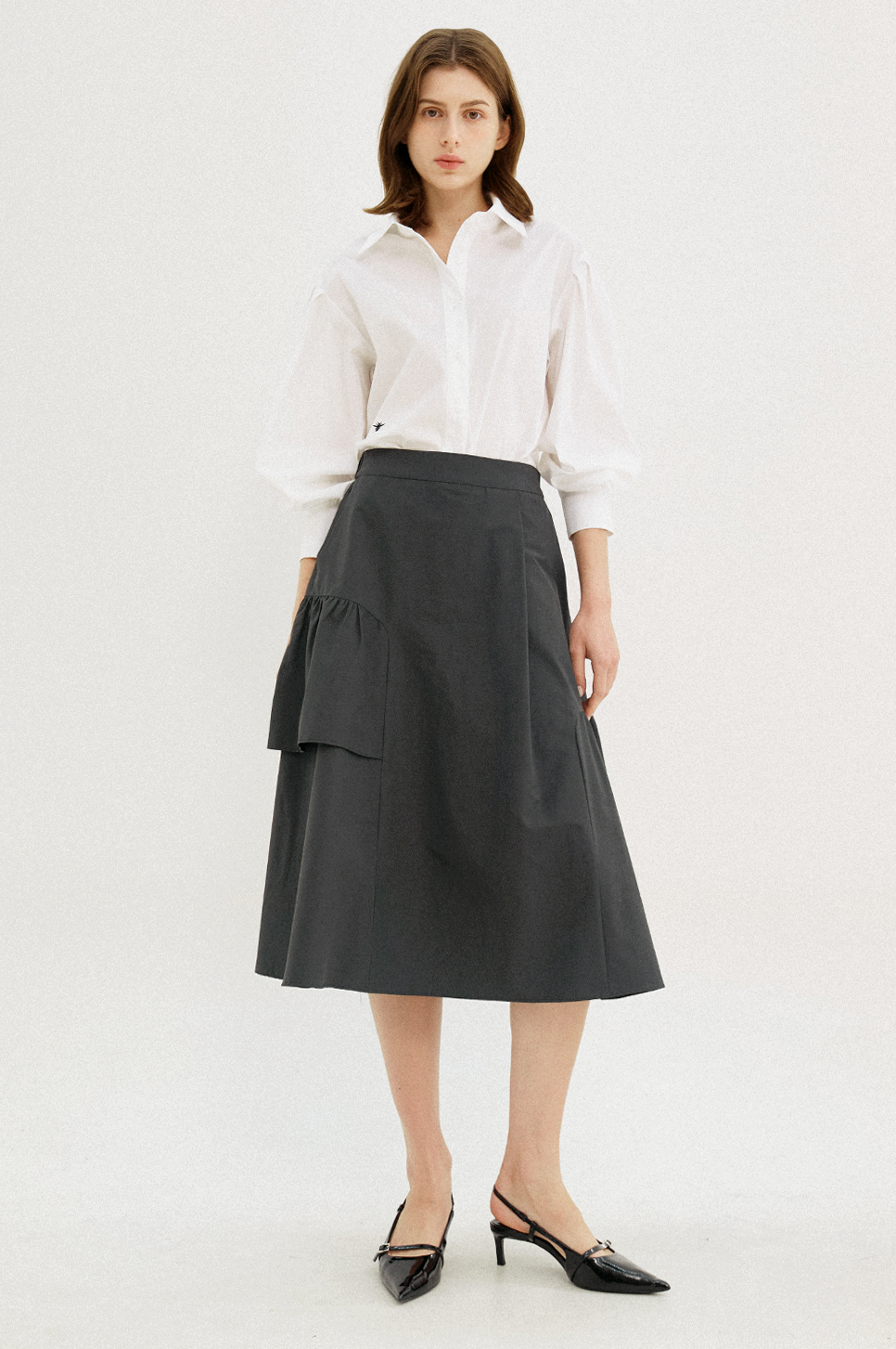 밑단과 앞 단작에 스티치 처리를 하여 완성도 있게 표현하며, 한쪽 하단에 자수 디테일을 더하여 고급스러운 무드가 돋보입니다.