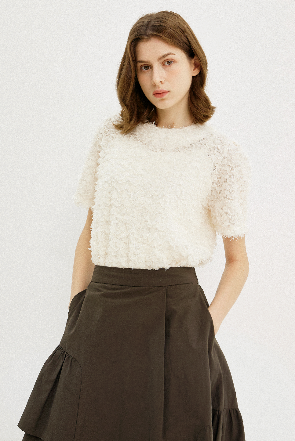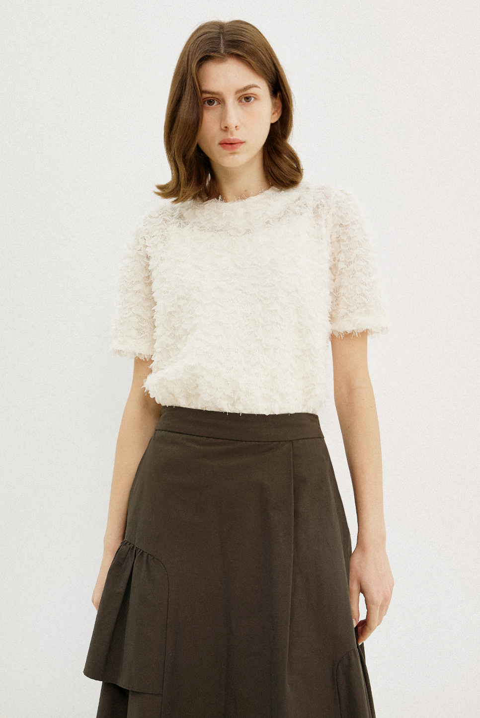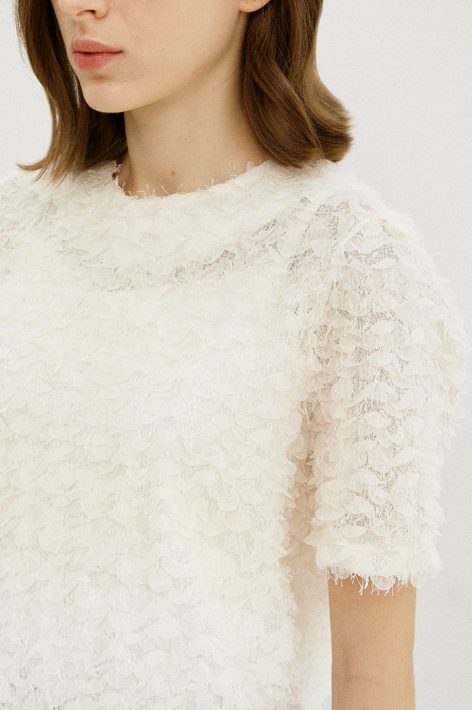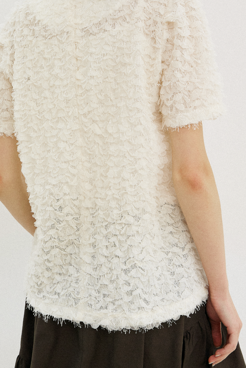 전체적으로 고르게 분포된 프린지 텍스처가 돋보이는 하프 슬리브 블라우스로, 프린지 디테일이 움직임에 따라 자연스러운 볼륨감을 더하며, 화려한 텍스쳐와 부드럽고 풍성한 실루엣이 어우러져 페미닌한 매력을 전해줍니다.
