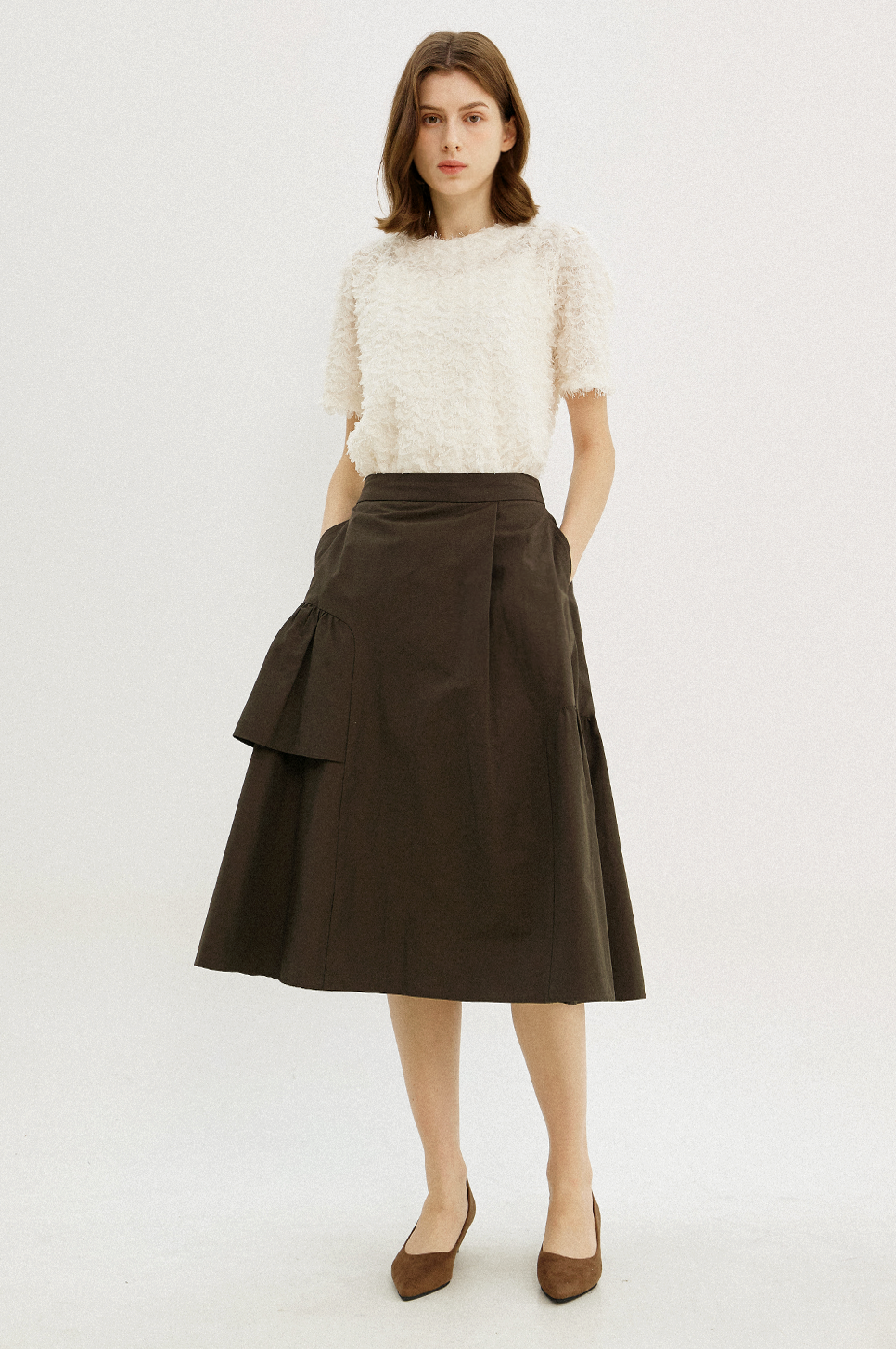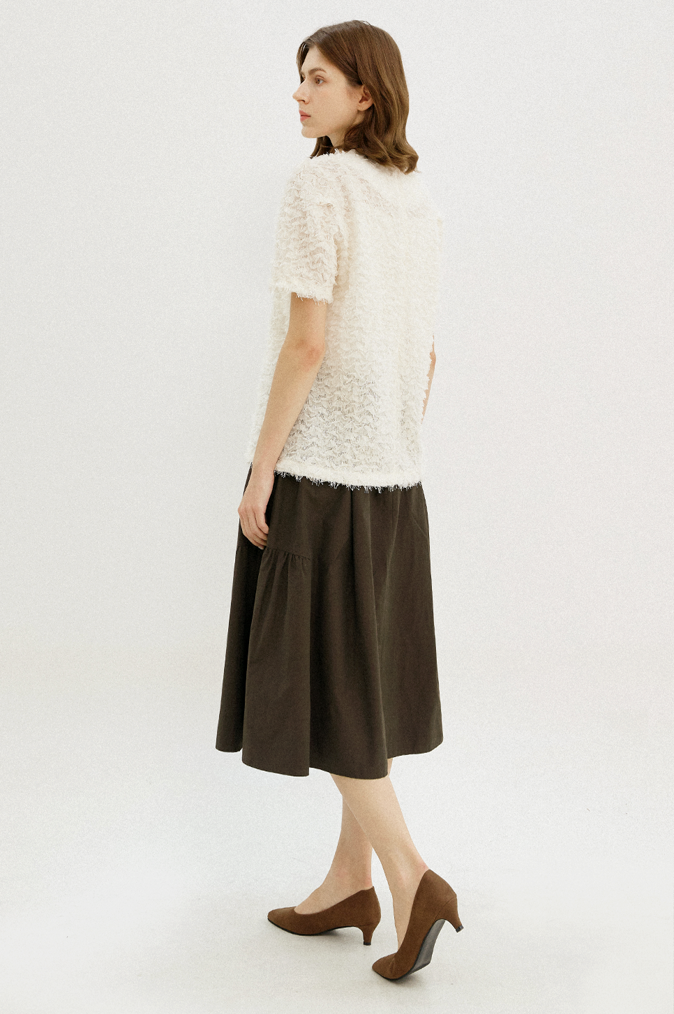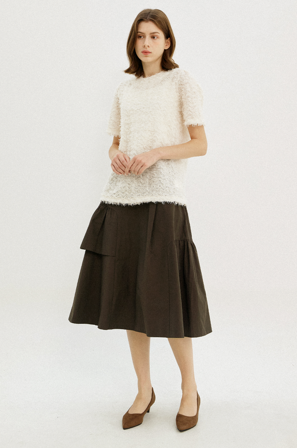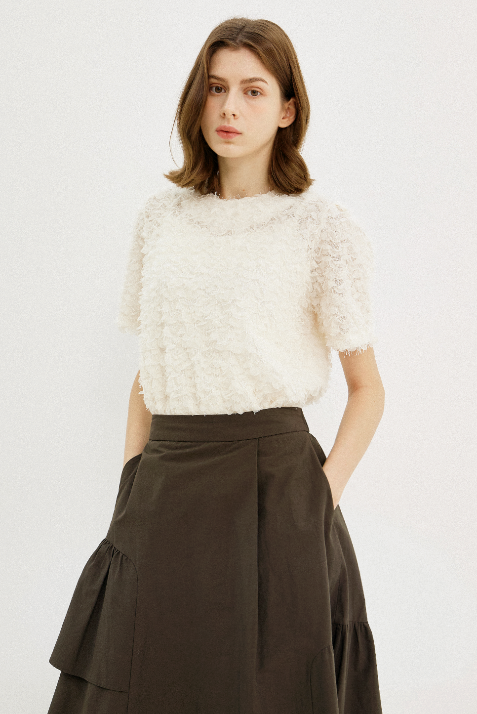 전체적으로 고르게 분포된 프린지 텍스처가 돋보이는 하프 슬리브 블라우스로, 프린지 디테일이 움직임에 따라 자연스러운 볼륨감을 더하며, 화려한 텍스쳐와 부드럽고 풍성한 실루엣이 어우러져 페미닌한 매력을 전해줍니다.